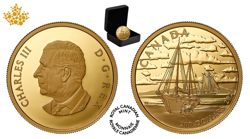 Designed by artist Yves Bérubé, the reverse side features two detailed views of a ketch, under sail in the distance and aground at low tide in the foreground. A horse-drawn wagon takes on logs, unloaded from amidships of the beached ketch, which waits for the tide’s return to carry it onward. Above and off-centre to the left along the rim is the text CANADA. Below and off-centre to the right along the lower rim is the denomination and year, 200 DOLLARS 2026. The obverse side includes the effigy of HM King Charles III created by Canadian artist Steven Rosati and depicts the King facing to the left surrounded by the legend CHARLES III D G REX.